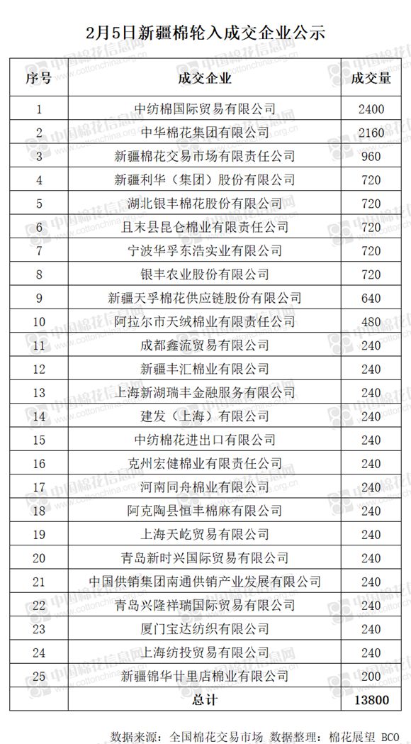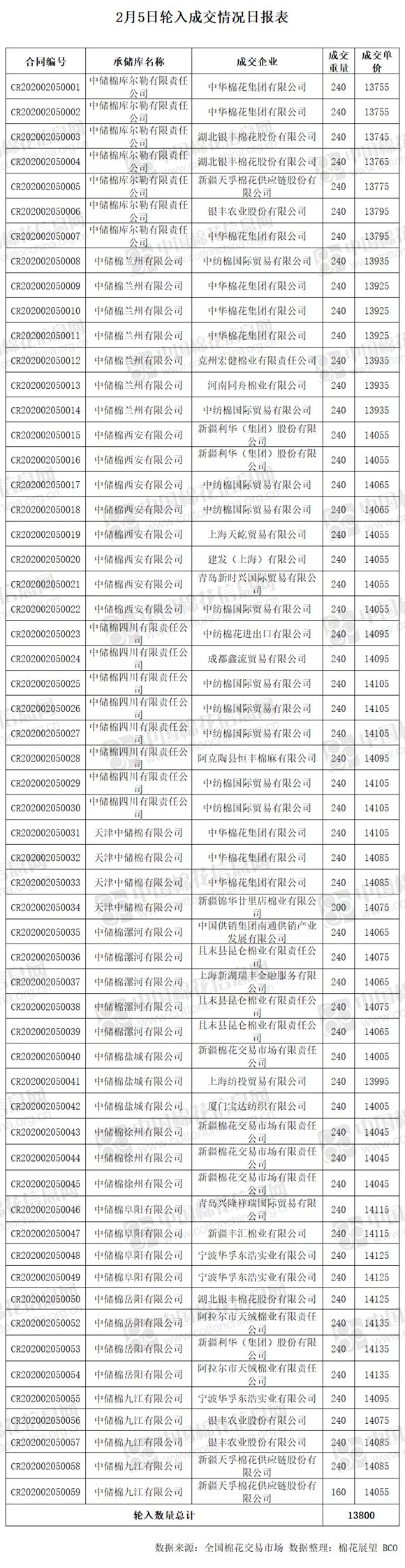 2月5日,中國儲備棉管理有限公司計劃采購新疆棉15000噸,實(shí)際成交13800噸,成交率92%,成交均價14024元/噸,最高成交價14135元/噸,最低成交價13745元/噸。 其中新疆庫成交1680噸,內(nèi)地庫成交12120噸。