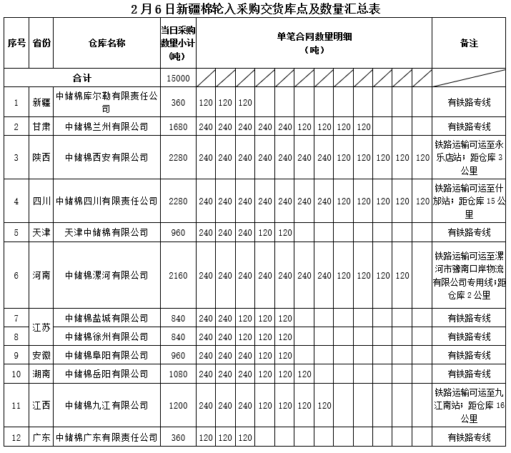中國(guó)儲(chǔ)備棉管理有限公司定于2020年2月6日采購(gòu)新疆棉15000噸(公定重量),最高限價(jià)14135元/噸(折標(biāo)準(zhǔn)級(jí)3128B價(jià)格)。具體庫點(diǎn)及數(shù)量如下:
