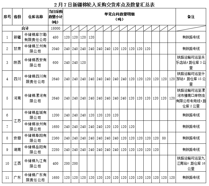 中國(guó)儲(chǔ)備棉管理有限公司定于2020年2月7日采購(gòu)新疆棉18000噸(公定重量),最高限價(jià)14135元/噸(折標(biāo)準(zhǔn)級(jí)3128B價(jià)格)。具體庫(kù)點(diǎn)及數(shù)量如下: