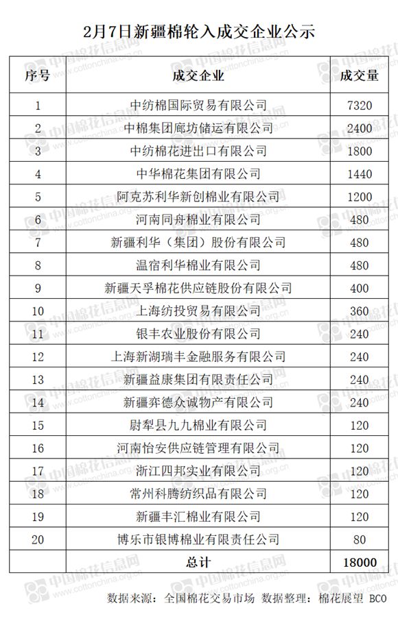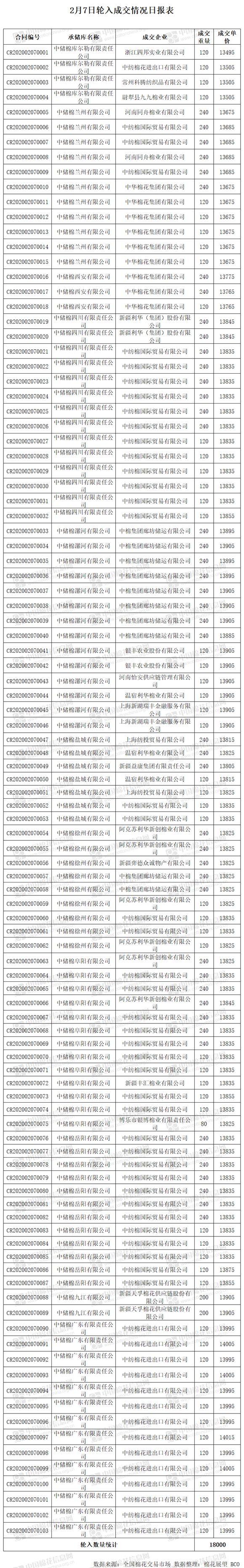2月7日,中國(guó)儲(chǔ)備棉管理有限公司計(jì)劃采購(gòu)新疆棉18000噸,實(shí)際成交18000噸,成交率100%,成交均價(jià)13832元/噸,最高成交價(jià)14015元/噸,最低成交價(jià)13495元/噸。 其中新疆庫(kù)成交480噸,內(nèi)地庫(kù)成交17520噸。