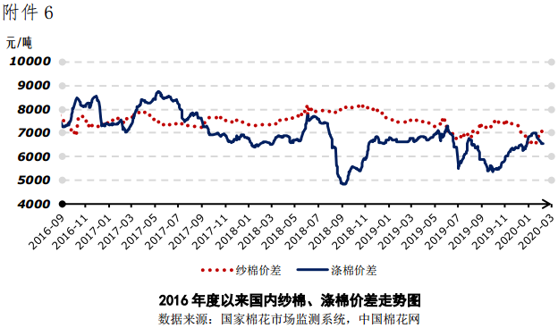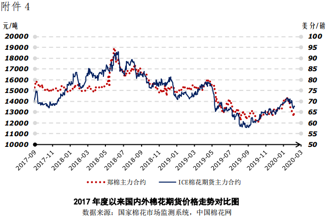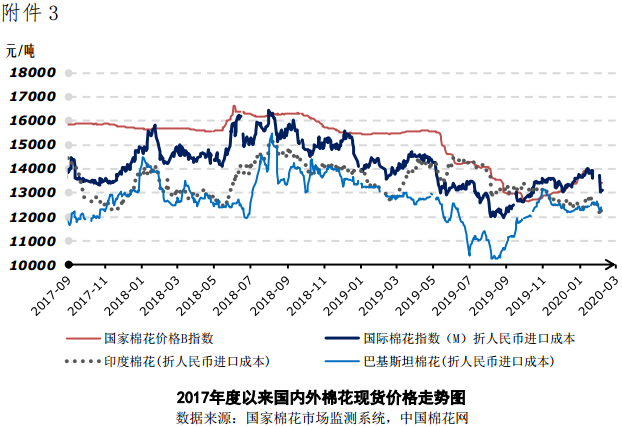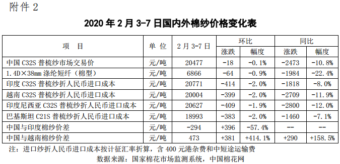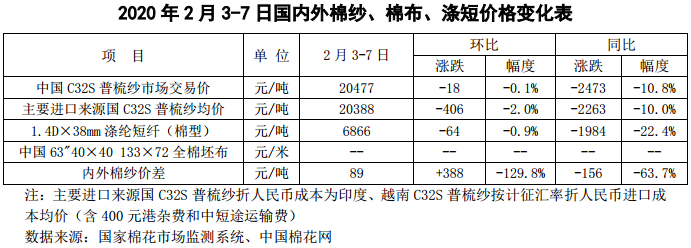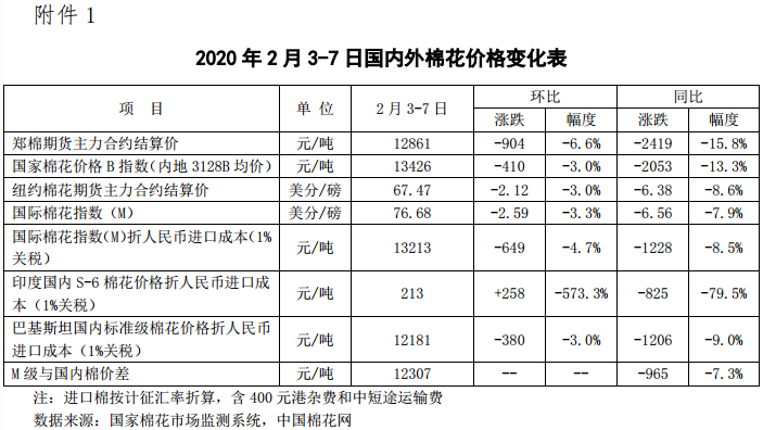 受疫情擴散影響,春節(jié)期間國際市場下跌幅度較大,加之中國政府為防疫工作推遲開工日期,期貨流動性銳減,節(jié)后首個交易日鄭棉開盤跌停,但隨后4個交易日逐步反彈修復(fù)。2月3-7日鄭州棉花期貨主力合約結(jié)算價12861元/噸,較前周下跌904元/噸,跌幅6.6%;代表內(nèi)地標(biāo)準(zhǔn)級皮棉市場價格的國家棉花價格B指數(shù)均價13426元/噸,較前周下跌410元/噸,跌幅3.0%。紐約棉花期貨主力合約結(jié)算價67.47美分/磅,較前周下跌2美分/磅,跌幅3.0%;代表進口棉中國主港到岸均價的國際棉花指數(shù)(M)均價76.68美分/磅,較前周下跌3美分/磅,跌幅3.3%,折人民幣進口成本13213元/噸(按1%關(guān)稅計算,含港雜和運費),較前周下跌649元/噸,跌幅4.7%,內(nèi)外棉價差由負(fù)轉(zhuǎn)正。