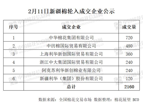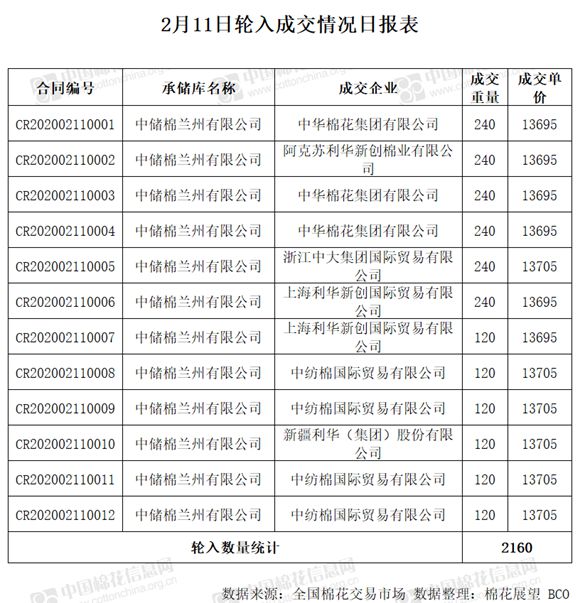 2月11日,中國儲備棉管理有限公司計(jì)劃采購新疆棉12000噸,實(shí)際成交2160噸,成交率18%,成交均價13699元/噸,最高成交價13705元/噸,最低成交價13695元/噸。 其中內(nèi)地庫成交2160噸。
