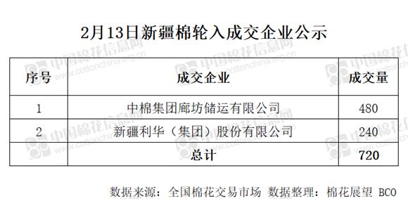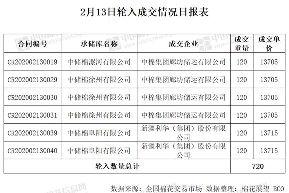 2月13日,中國儲備棉管理有限公司計劃采購新疆棉7000噸,實際成交720噸,成交率10.29%,成交均價13708元/噸,最高成交價13715元/噸,最低成交價13705元/噸。 其中內地庫成交720噸。