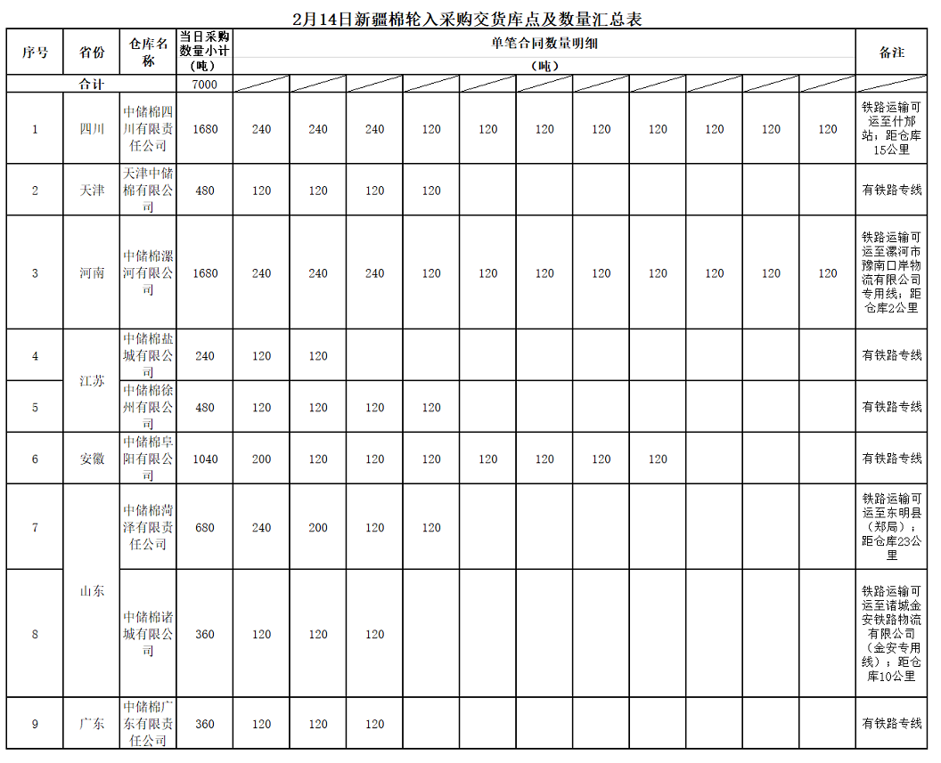 中國儲備棉管理有限公司定于2020年2月14日采購新疆棉7000噸(公定重量),最高限價14135元/噸(折標(biāo)準(zhǔn)級3128B價格)。具體庫點及數(shù)量如下: