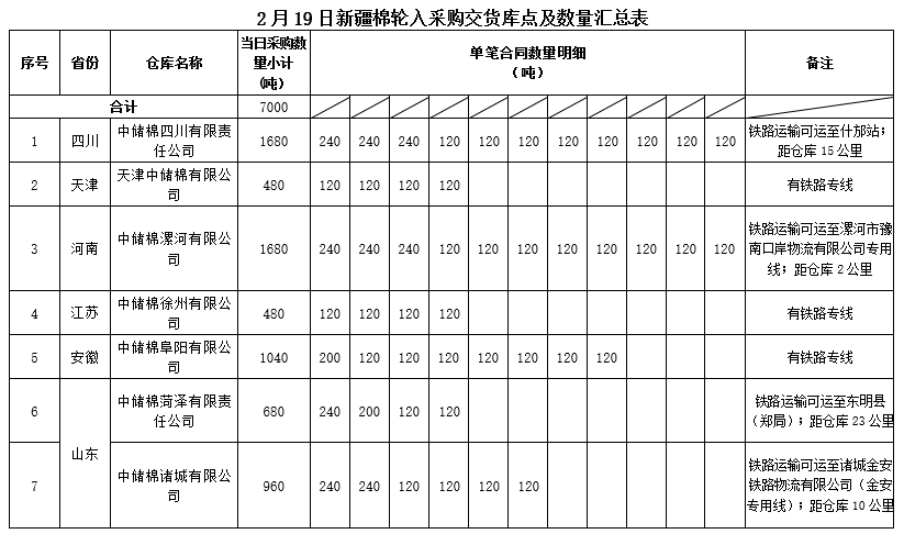 中國儲備棉管理有限公司定于2020年2月19日采購新疆棉7000噸(公定重量),最高限價13672元/噸(折標(biāo)準(zhǔn)級3128B價格)。具體庫點及數(shù)量如下:
