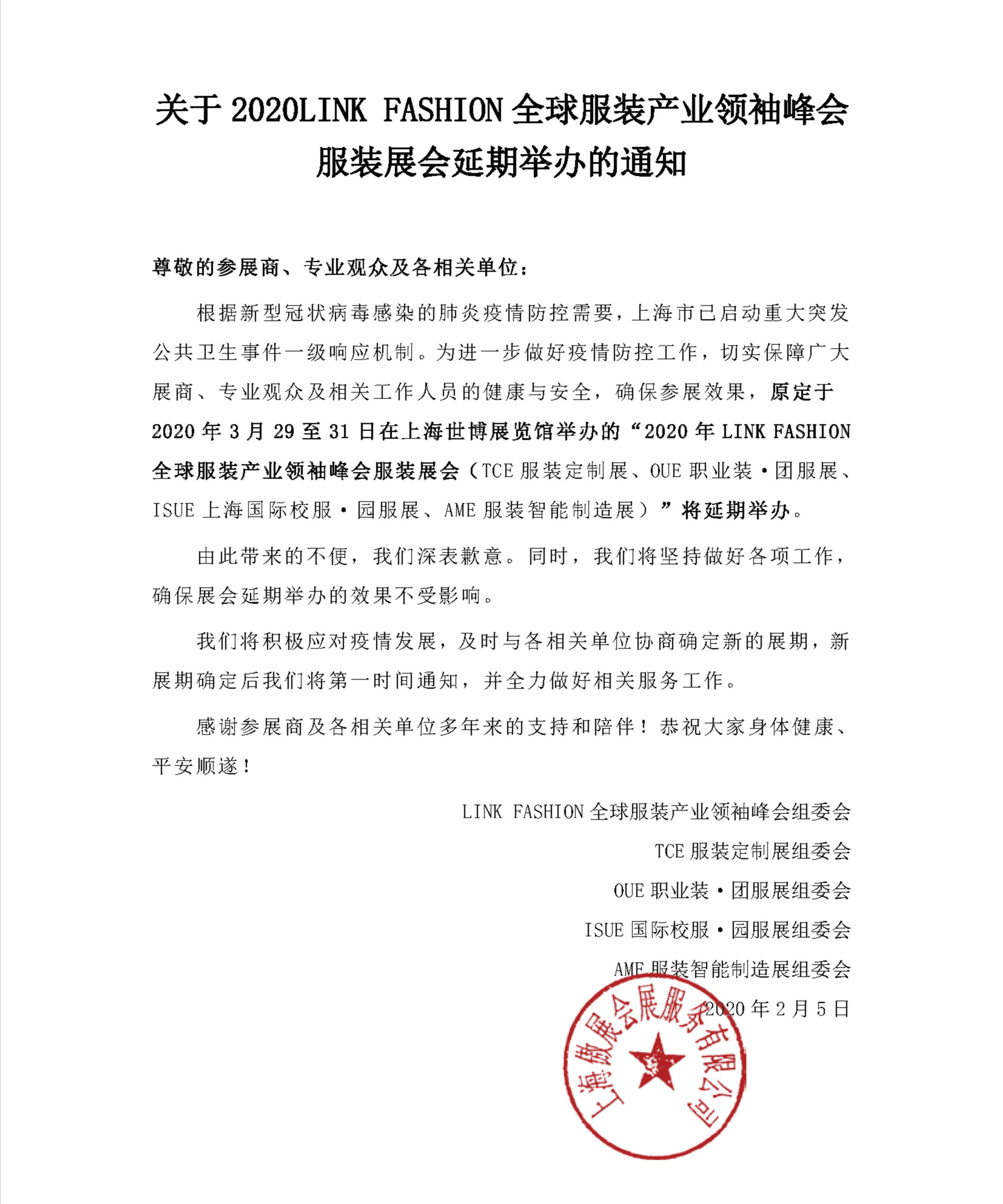 尊敬的參展商、專業(yè)觀眾及各相關(guān)單位:根據(jù)新型冠狀病毒感染的肺炎疫情防控需要,上海市已啟動重大突發(fā)公共衛(wèi)生事件一級響應(yīng)機制。為進一步做好疫情防控工作,切實保障廣大展商、專業(yè)觀眾及相關(guān)工作人員的健康與安全,確保參展效果,原定于2020年3月29至31日在上海世博展覽館舉辦的“2020年LINK FASHION全球服裝產(chǎn)業(yè)領(lǐng)袖峰會服裝展會(TCE服裝定制展、OUE職業(yè)裝·團服展、ISUE上海國際校服·園服展、AME服裝智能制造展)”將延期舉辦。由此帶來的不便,我們深表歉意。同時,我們將堅持做好各項工作,確保展會延期舉辦的效果不受影響。我們將積極應(yīng)對疫情發(fā)展,及時與各相關(guān)單位協(xié)商確定新的展期,新展期確定后我們將第一時間通知,并全力做好相關(guān)服務(wù)工作。感謝參展商及各相關(guān)單位多年來的支持和陪伴!恭祝大家身體健康、平安順遂!