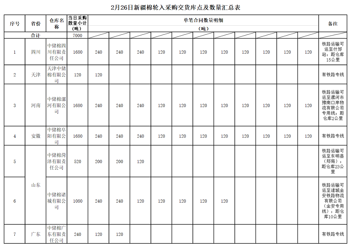 中國(guó)儲(chǔ)備棉管理有限公司定于2020年2月26日采購(gòu)新疆棉7000噸(公定重量),最高限價(jià)13716元/噸(折標(biāo)準(zhǔn)級(jí)3128B價(jià)格)。具體庫(kù)點(diǎn)及數(shù)量如下: