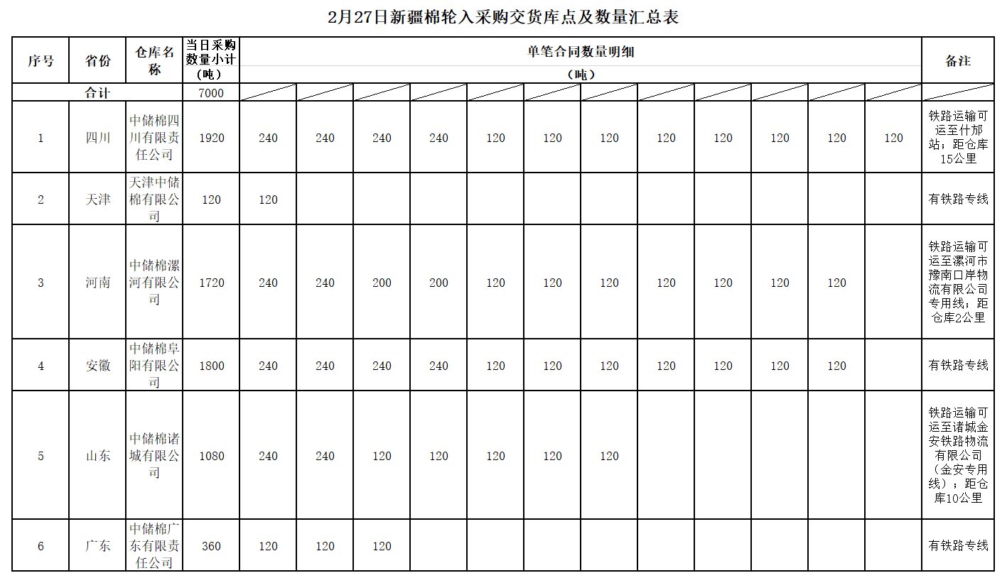 中國(guó)儲(chǔ)備棉管理有限公司定于2020年2月27日采購(gòu)新疆棉7000噸(公定重量),最高限價(jià)13716元/噸(折標(biāo)準(zhǔn)級(jí)3128B價(jià)格)。具體庫(kù)點(diǎn)及數(shù)量如下: