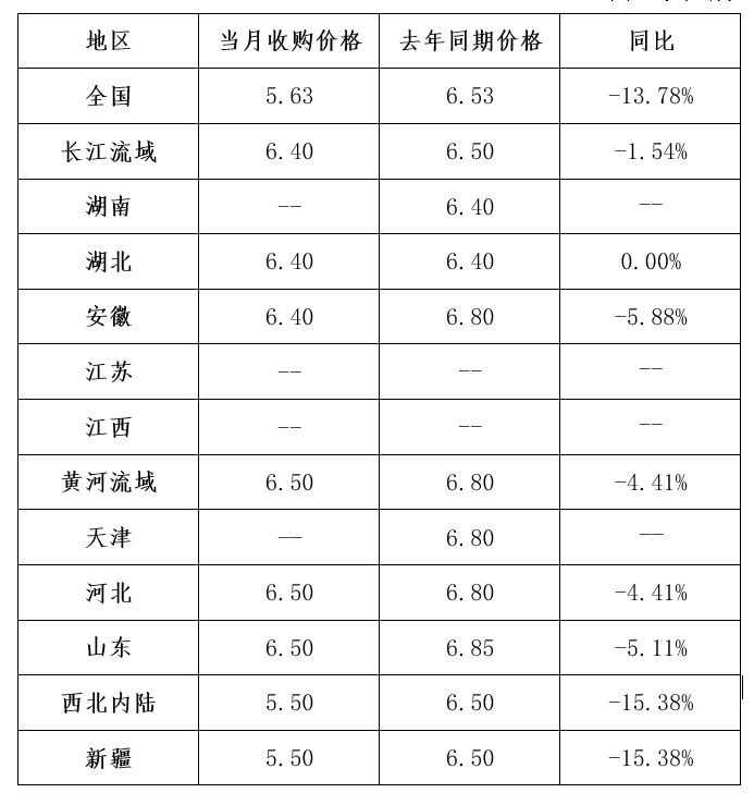 2020年1月全國標準級籽棉平均收購價分地區(qū)統(tǒng)計表(單位:元/公斤)