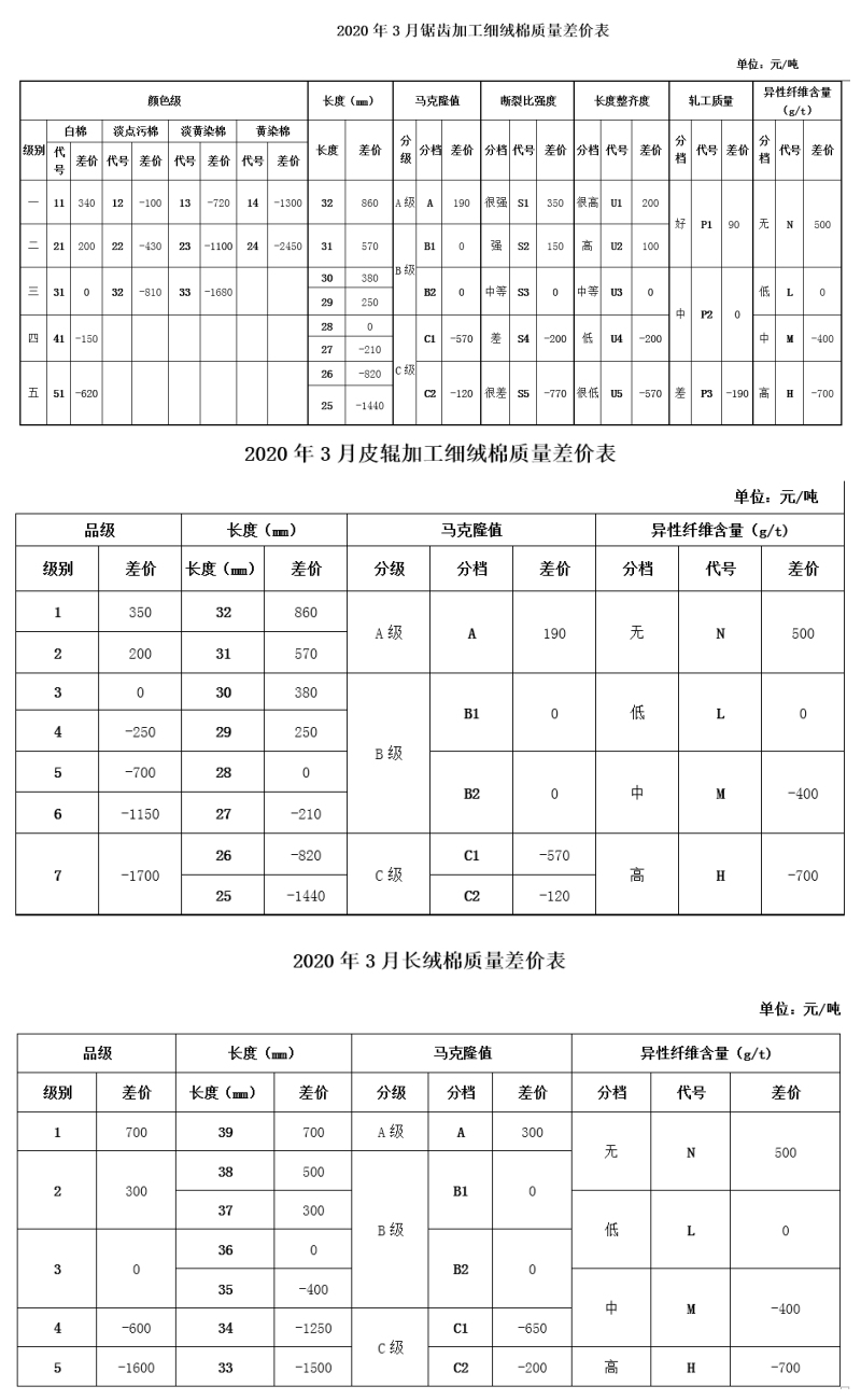 根據(jù)《中國棉花協(xié)會國產(chǎn)棉質(zhì)量差價表管理辦法》規(guī)定,現(xiàn)正式發(fā)布2020年3月《鋸齒加工細(xì)絨棉質(zhì)量差價表》、《皮輥加工細(xì)絨棉質(zhì)量差價表》和《長絨棉質(zhì)量差價表》(單位:元/噸)。