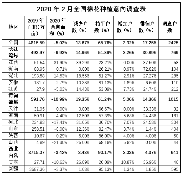 2020年2月底,中國(guó)棉花協(xié)會(huì)對(duì)內(nèi)地12個(gè)省市和新疆自治區(qū)共2425個(gè)定點(diǎn)農(nóng)戶進(jìn)行第三次2020年植棉意向面積調(diào)查,結(jié)果顯示:2020年全國(guó)植棉意向面積4573.57萬(wàn)畝,同比下降5.03%,降幅較上期縮小0.33個(gè)百分點(diǎn)。其中新疆降幅較上期縮小,長(zhǎng)江流域和黃河流域降幅較上期有所擴(kuò)大。