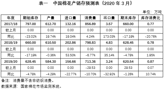 受疫情影響,美國農(nóng)業(yè)部最新全球棉花產(chǎn)需預(yù)測(cè)下調(diào)2019/20年度全球棉花消費(fèi)量,具體情況如下:2019/20年度全球棉花產(chǎn)量2647.4萬噸,較上月調(diào)增5.7萬噸,消費(fèi)量2572.7萬噸,較上月調(diào)減18.5萬噸,產(chǎn)大于需74.7萬噸。全球棉花期末庫存消費(fèi)比為70.58%,為近4年來新高。中國以外市場(chǎng)期末庫存量超過1000萬噸,達(dá)到1064.8萬噸,為近5年來新高。疫情爆發(fā)以來,全球棉花消費(fèi)預(yù)期大幅下降,市場(chǎng)信心受挫,國內(nèi)外棉價(jià)齊跌。ICE棉花期貨和鄭州棉花期貨主力合約分別于3月12日和13日跌破12000元/噸和60美分/磅整數(shù)關(guān)口。在疫情沒有好轉(zhuǎn)前,預(yù)計(jì)棉價(jià)將繼續(xù)承壓維持弱勢(shì)。