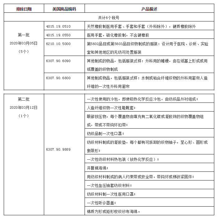 美國當?shù)貢r間2020年3月12日,美國貿(mào)易代表辦公室(USTR)公布第二批3000億美元加征關(guān)稅商品清單項下的產(chǎn)品排除公告,第一批排除的8個稅號(其中5個為紡織服裝稅號,詳見下表)為完全排除,這次排除新增稅號3926.90.9990、6307.90.9889、8479.89.6500、9004.90.0000項下的部分排除產(chǎn)品,都是醫(yī)療相關(guān)用品,其中包括紡織服裝產(chǎn)品1個稅號:6307.90.9889。被排除的產(chǎn)品在出口美國時將不再被加征7.5%的關(guān)稅。本公告列明的被排除產(chǎn)品的有效期為2019年9月1日至2020年9月1日。