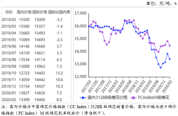 (一)國內(nèi)棉價下跌。2月上旬,隨著儲備棉輪入力度加大,供大于求壓力緩解,市場信心提振,棉價振幅收窄。下旬開始,紡企陸續(xù)復工,但中小企業(yè)開工率普遍不足,且原材料以消化庫存為主,補庫采購清淡。隨著美國、意大利、日本、韓國等主要紡織服裝進口國新冠肺炎疫情持續(xù),國內(nèi)市場對未來需求恢復擔憂再次加劇,棉價持續(xù)下跌。2月國內(nèi)3128B級棉花月均價每噸13418元,環(huán)比跌