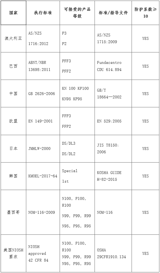 2020年3月17日,美國(guó)疾病控制與預(yù)防中心(CDC)發(fā)布《優(yōu)化N95口罩供應(yīng)策略:危機(jī)/替代策略》,指出新冠肺炎疫情期間,當(dāng)N95口罩供給不足時(shí),按下表中標(biāo)準(zhǔn)生產(chǎn)的口罩,是N95口罩合適的替代品。其中包括采用中國(guó)標(biāo)準(zhǔn)GB2626-2006和GB/T18664-2002生產(chǎn)的口罩。具體見(jiàn)下表:
