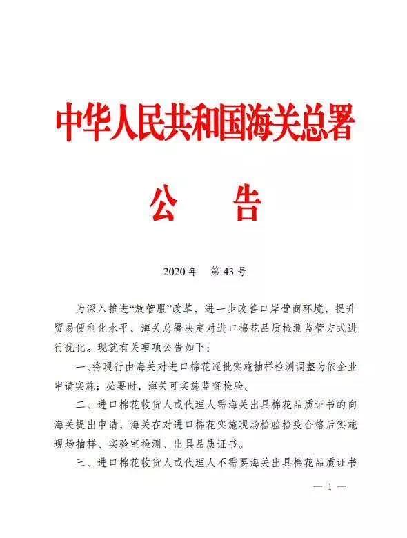 一、將現(xiàn)行由海關(guān)對(duì)進(jìn)口棉花逐批實(shí)施抽樣檢測(cè)調(diào)整為依企業(yè)申請(qǐng)實(shí)施;必要時(shí),海關(guān)可實(shí)施監(jiān)督檢驗(yàn)。