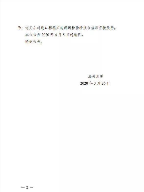 三、進(jìn)口棉花收貨人或代理人不需要海關(guān)出具棉花品質(zhì)證書(shū)的,海關(guān)在對(duì)進(jìn)口棉花實(shí)施現(xiàn)場(chǎng)檢驗(yàn)檢疫合格后直接放行。