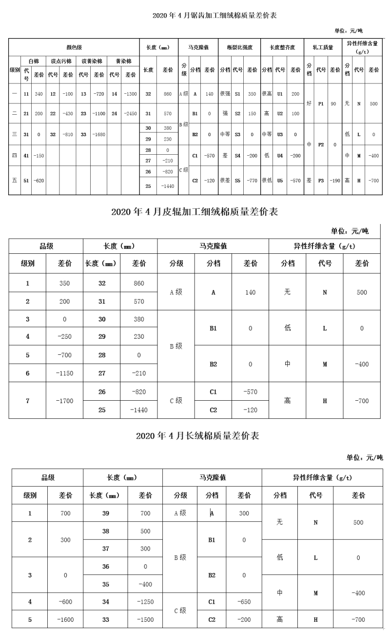 根據(jù)《中國棉花協(xié)會國產(chǎn)棉質(zhì)量差價表管理辦法》規(guī)定,現(xiàn)正式發(fā)布2020年4月《鋸齒加工細(xì)絨棉質(zhì)量差價表》、《皮輥加工細(xì)絨棉質(zhì)量差價表》和《長絨棉質(zhì)量差價表》(單位:元/噸)。