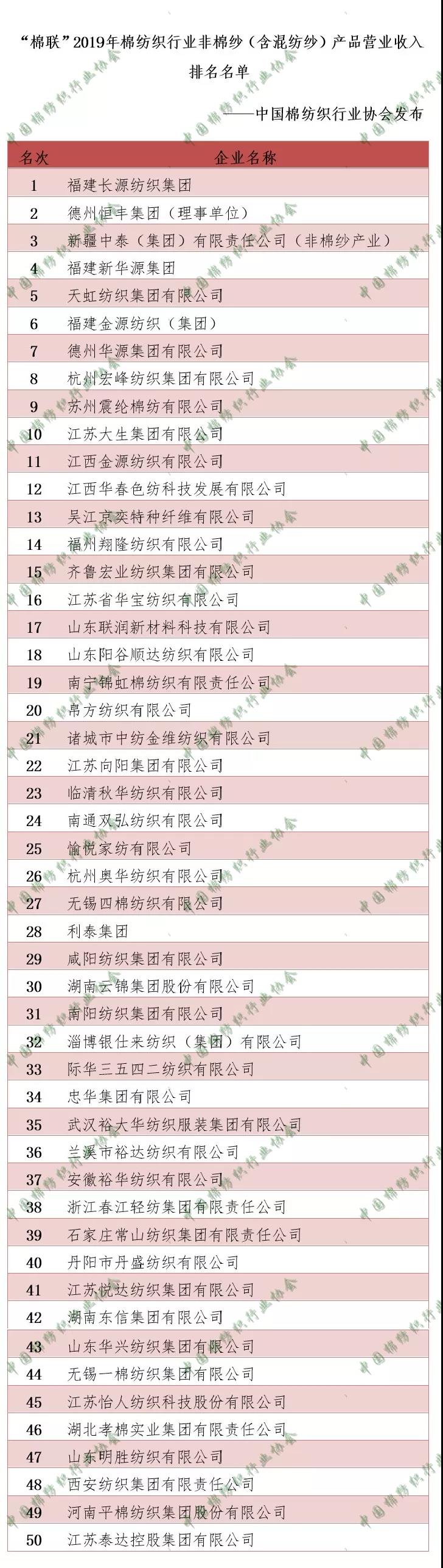 5月7日,中國棉紡織行業(yè)協(xié)會(huì)正式發(fā)布,2019年棉紡織行業(yè)“非棉紗(含混紡紗)產(chǎn)品”營業(yè)收入排名名單(具體名單詳見下文)。