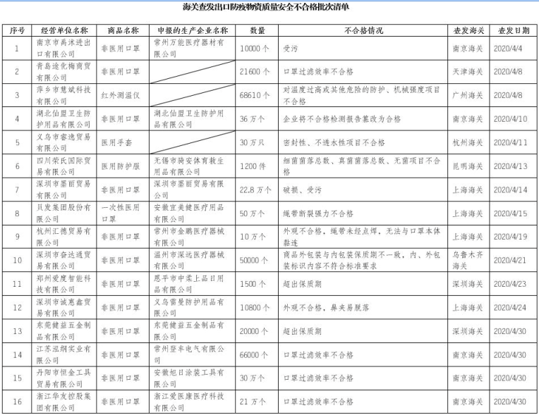 海關(guān)總署公布全國海關(guān)近期查發(fā)出口防疫物資質(zhì)量安全不合格批次清單