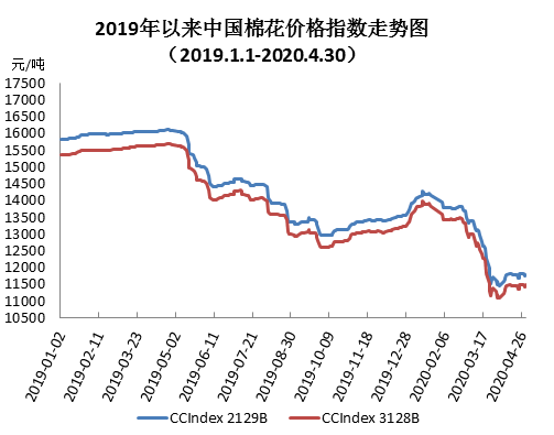 4月國內紡企均已正常復產,大部分紡企棉花原料庫存較充足,因紡織下游訂單需求不佳,多數(shù)企業(yè)復工后開機率不足,因此原料采購多保持隨用隨購。月末中國棉花價格指數(shù)(CCIndex3128B)11501元/噸,較上月末上漲410元;月均價11396元/噸,環(huán)比下跌798元,同比下跌4263元。