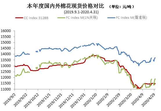 4月底部分歐美國家放松對疫情封鎖措施,提升市場信心,原油價格大幅上漲,國際棉價也快速上漲。中國進口棉價格指數(shù)FCIndexM月均65.14美分/磅,環(huán)比跌4.2美分。月末68.58美分/磅,高于上月末5.33美分,1%關稅下折人民幣11906元/噸,高于同期國內現(xiàn)貨405元,外棉價格由上月末的低于國內143元轉為高于國內405元。