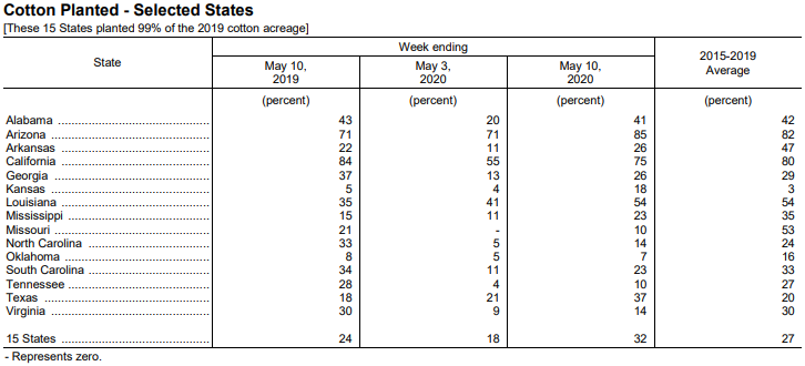 美國農(nóng)業(yè)部5月11日發(fā)布美國棉花生產(chǎn)報(bào)告顯示,截至2020年5月10日,美棉播種進(jìn)度32%,較前周增加14個(gè)百分點(diǎn),較去年同期增加8個(gè)百分點(diǎn),較近5年均值增加5個(gè)百分點(diǎn)。目前美國所有產(chǎn)棉州均已開始播種,核心棉區(qū)得克薩斯州表現(xiàn)最好,播種進(jìn)度較前周大增16個(gè)百分點(diǎn),較去年同期增加19個(gè)百分點(diǎn),近5年同期均值增加17個(gè)百分點(diǎn),是上周美棉播種大大加快主要因素。
