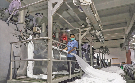 在浙江迎豐科技股份有限公司生產(chǎn)車間,工人們正在從德國引進(jìn)的低浴比水洗機(jī)前忙碌。作為柯橋區(qū)首批搬遷落戶印染集聚區(qū)的企業(yè),公司一直堅持“節(jié)能、減排、環(huán)?!崩砟?,堅持產(chǎn)品高定位、研發(fā)高投入,經(jīng)營效益穩(wěn)步增長,已連續(xù)4年成為紹興市工業(yè)畝均效益“領(lǐng)跑者”,其目標(biāo)是打造一家從坯布到成品的印染智慧工廠。