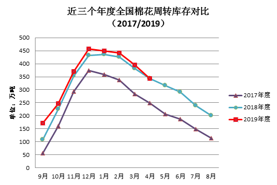 4月國(guó)內(nèi)紡企生產(chǎn)基本恢復(fù),但需求不足,導(dǎo)致成品積壓,用棉企業(yè)采購(gòu)棉花比較謹(jǐn)慎,月末周轉(zhuǎn)庫(kù)存繼續(xù)下降。據(jù)中國(guó)棉花協(xié)會(huì)棉花物流分會(huì)對(duì)全國(guó)18個(gè)省市152家棉花交割和監(jiān)管倉(cāng)庫(kù)調(diào)查數(shù)據(jù)顯示:4月底全國(guó)棉花周轉(zhuǎn)庫(kù)存總量約344萬(wàn)噸,較上月減少52.32萬(wàn)噸,降幅13.2%,降幅較上月擴(kuò)大2.78%。