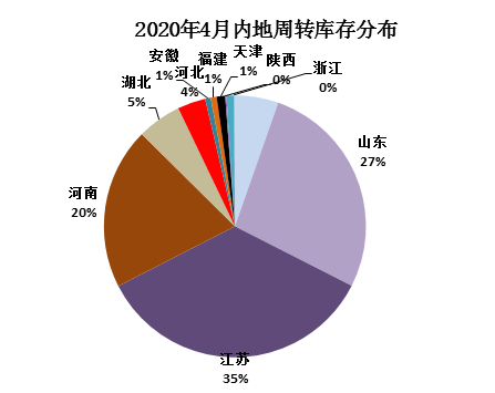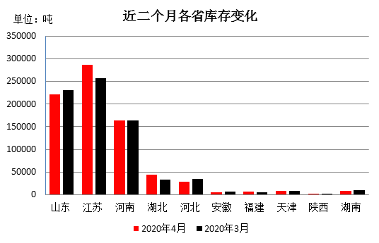 分省份看,江蘇省庫(kù)存量居首位為28.62萬(wàn)噸,山東省次之為22.21萬(wàn)噸,河南省居第三位為16.35萬(wàn)噸,湖北省為4.47萬(wàn)噸,河北省為2.83萬(wàn)噸,其他省在萬(wàn)噸以下。