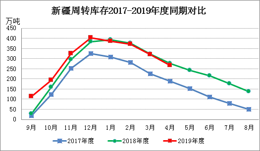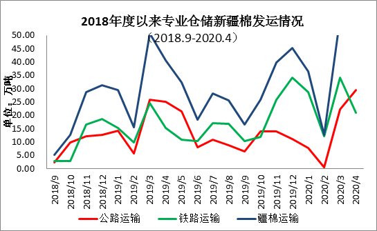 2019年度(2019年9月-2020年4月)出疆棉公路與鐵路共發(fā)運(yùn)283.51萬(wàn)噸,同比增加69.78萬(wàn)噸。