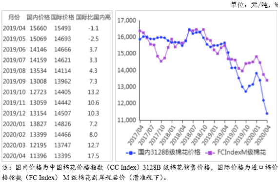 (二)國際棉價跌幅收窄。4月國外新冠病例數(shù)仍在快速增加,國際油價歷史性跌破零值,洲際交易所(ICE)棉花期貨主力合約跌至每磅48.2美分,創(chuàng)近十年新低,全球棉紡織產(chǎn)業(yè)鏈受沖擊明顯,國際棉價繼續(xù)下跌。但各國封鎖措施有所放松,國際棉價跌幅收窄。4月CotlookA指數(shù)(相當于國內(nèi)3128B級棉花)月均價每磅63.53美分,環(huán)比跌6.1%,同比跌27.2%。