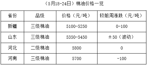 上周,期貨豆油低位反彈力度不佳,現(xiàn)貨震蕩調(diào)整。周末沿海地區(qū)一級(jí)豆油價(jià)格至5520-5550元/噸,較前周末下跌20元/噸,利空棉油行情,使部分棉油價(jià)格持續(xù)下跌。但目前棉籽價(jià)格高位難下,成本支撐棉油行情。時(shí)至5月中下旬,棉籽資源量不足,油棉廠開工率較低,棉油供應(yīng)有限,支撐廠家對(duì)棉油持價(jià)信心。上周部分價(jià)格較低棉油廠家上調(diào)報(bào)價(jià),棉油整體漲跌互現(xiàn)。距離新棉油上市時(shí)間較長(zhǎng),未來(lái)棉油在參照外圍油脂走勢(shì)下,或保持震蕩調(diào)整格局運(yùn)行。