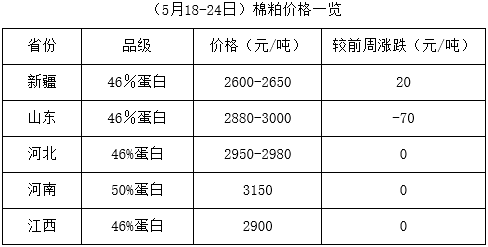 上周(5月18-24日),“兩會(huì)”召開期間,市場(chǎng)經(jīng)濟(jì)穩(wěn)步復(fù)蘇,期貨大豆及豆類產(chǎn)品震蕩調(diào)整,上漲幅度有限,難以有力支撐棉副產(chǎn)品行情,而棉籽處青黃不接之時(shí),各地資源匱乏,價(jià)格高位有漲,油棉榨利仍處虧損,市場(chǎng)經(jīng)營(yíng)難度不減。