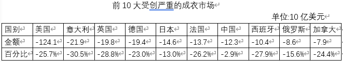注意:該圖表顯示以美元計算10大受創(chuàng)最嚴(yán)重全球成衣市場。金額和百分比下降表明,我們修正2020年預(yù)測與2019年市場規(guī)模之間差異。