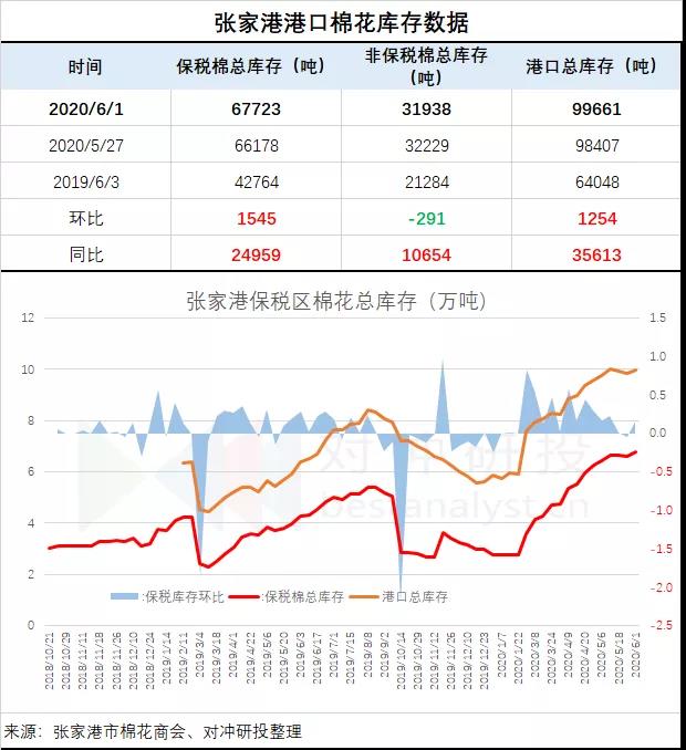 據(jù)張家港市棉花商會(huì),截止2020年6月1日,張家港非保稅棉31938噸,保稅棉67723噸,共99661噸。進(jìn)區(qū)5837噸,出區(qū)4583噸。