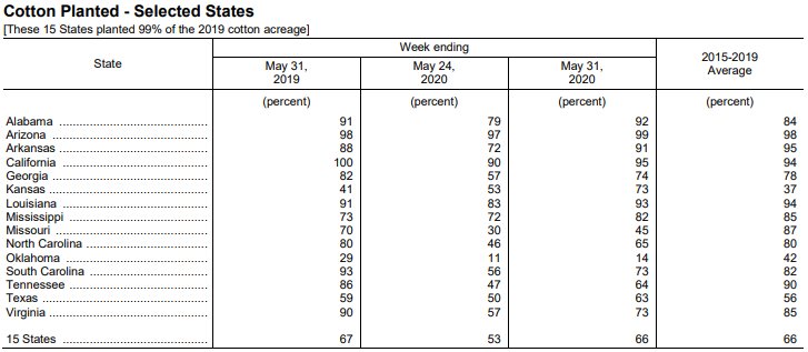 美國(guó)農(nóng)業(yè)部6月2日發(fā)布的美國(guó)棉花生產(chǎn)報(bào)告顯示,截至5月31日當(dāng)周,美棉播種進(jìn)度為66%,前周為53%,去年同期為67%,五年均值為66%。美棉現(xiàn)蕾率為8%,去年同期和五年均值為7%,美棉長(zhǎng)勢(shì)為良好以上的占44%,去年同期為46%。