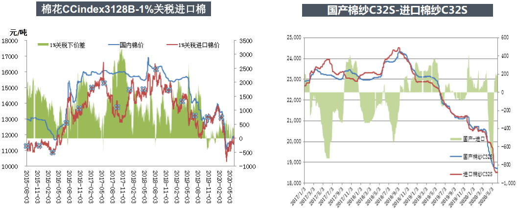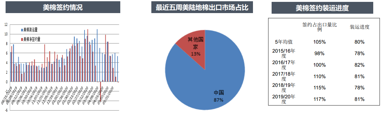 據(jù)USDA報告,美國農(nóng)業(yè)部報告顯示,2020年5月22-28日,2019/20年度美國陸地棉凈簽約量-2290噸,較前周和前四周平均值大幅減少,新增簽約5443噸,主要來自中國臺灣地區(qū)(748噸)、孟加拉國(725噸)、印度尼西亞(340噸),取消簽約7733噸,主要來自土耳其(2767噸)、越南(998噸)、中國(1043噸)。2019/20年度美國陸地棉裝運量5.4萬噸,較前周減少11%。截至當(dāng)周,美國陸地棉累計簽約量370.3萬噸,簽約進度117%,5年均值105%。累計裝運量256.64萬噸,裝運進度81%,5年均值80%。最近六周,中國突然大量簽約美國陸地棉,一共簽約23.72萬噸,前幾周簽約量大,最近一周簽約量為負(fù)。