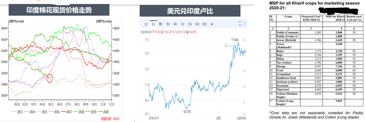 有消息稱,印度政府宣布提高2020/21年度棉花最低收購價(MSP),新的最低收購價分別定為5515盧比/公擔(dān)和5825盧比/公擔(dān)(去年分別為5255盧比/公擔(dān)和5550盧比/公擔(dān)),比去年提高5%。折合美元報價(77-78美分和82-83美分)。據(jù)統(tǒng)計,本年度截至5月底,印度棉花公司(CCI)在全國收購945萬包棉花(折160萬噸左右)。