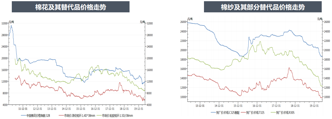 目前棉花、滌綸短纖、粘膠短纖價格都位于歷史相對低位,棉紗替代品價格也基本位于歷史價格低位。最近一周滌綸短纖和粘膠短纖價格相對穩(wěn)定,周五略有上漲。