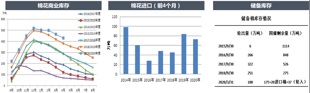 國儲庫存截止3月31日,儲備棉庫存有232萬噸。往年5月已開始輪出儲備棉,今年到現(xiàn)在仍沒有任何輪出消息,考慮今年棉價太低,國家不會再輪出增加市場負(fù)擔(dān),預(yù)計今年輪出可能性較低。