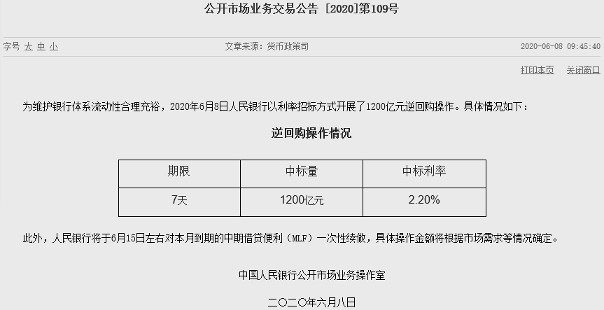 中國央行:人民銀行將于6月15日左右對本月到期的中期借貸便利(MLF)一次性續(xù)做,具體操作金額將根據(jù)市場需求等情況確定。