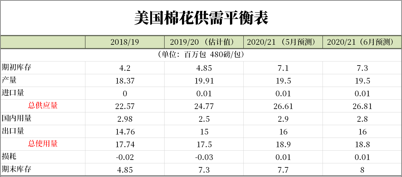 美國農(nóng)業(yè)部發(fā)布6月全球供需預(yù)測顯示,美國2019/20年度棉花消費量調(diào)減20萬包為250萬包、2020/21年度消費量調(diào)減10萬包。2019/20年度、2020/21年度期末庫存730萬包、800萬包。2020/21年度庫存消費比為43%,同比略微上升,明顯高于近幾年水平,但遠(yuǎn)低于2007/08年度的55%。