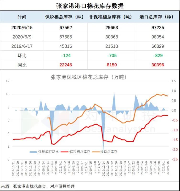 據(jù)張家港市棉花商會(huì),截止2020年6月15日,張家港非保稅棉29663噸,保稅棉67562噸,共97225噸。進(jìn)區(qū)1966噸,出區(qū)2797噸。