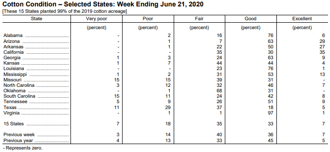 美國農(nóng)業(yè)部6月22日發(fā)布的美國棉花生產(chǎn)報(bào)告顯示,截至6月21日,美棉種植率為96%,前周為89%,去年同期為94%,5年均值為96%。美棉現(xiàn)蕾率為27%,前周為16%,去年同期為27%,5年均值為26%。美棉結(jié)鈴進(jìn)度為6%,去年同期為2%,5年均值為4%。美棉生長狀況達(dá)到良好以上的占40%,較前周減少3個(gè)百分點(diǎn),較去年同期減少10個(gè)百分點(diǎn),其中得州優(yōu)良率僅23%,是所有產(chǎn)棉州中最差的,去年同期優(yōu)良率為41%。