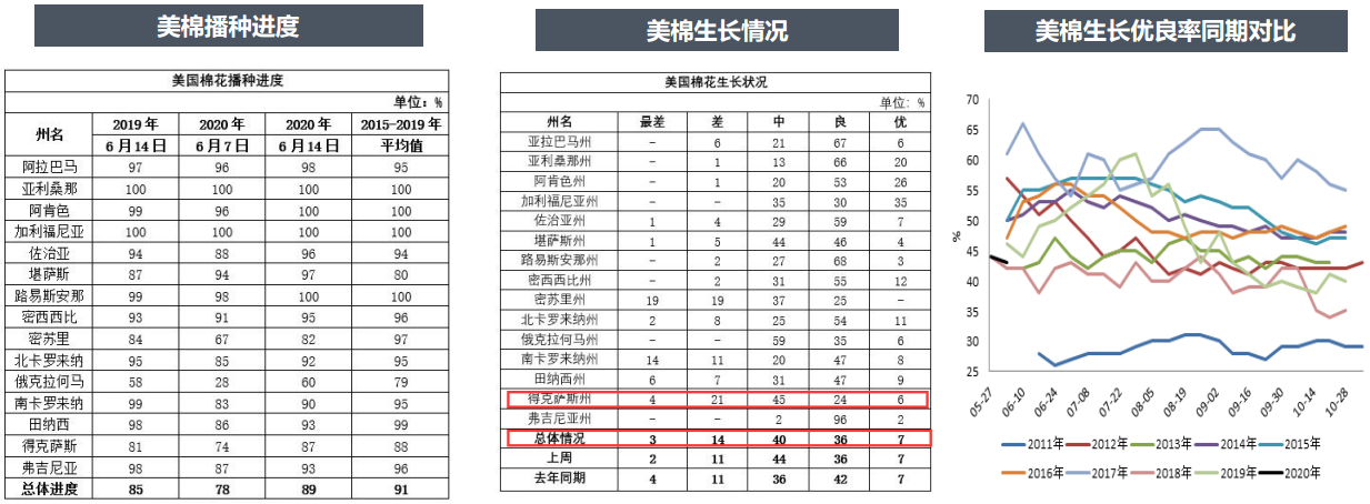 美國農(nóng)業(yè)部6月15日發(fā)布的美國棉花生產(chǎn)報告顯示,截至6月14日,美棉播種進(jìn)度89%,比去年同期增加4個百分點(diǎn),比過去5年平均值減少2個百分點(diǎn)。美棉現(xiàn)蕾率16%,比去年同期減少1個百分點(diǎn),比過去5年平均值持平。美棉生長狀況達(dá)到良好以上的占43%,較前周持平,較去年同期減少6個百分點(diǎn)。主產(chǎn)棉區(qū)得州優(yōu)良率僅30%。