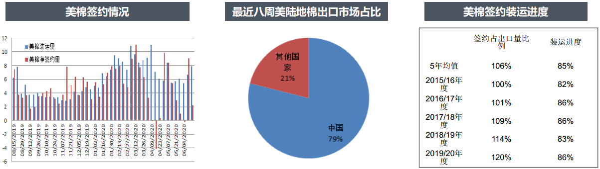 據(jù)USDA最新報告,6月11日一周,2019/20年度美國陸地棉凈簽約量2.21萬噸,環(huán)比減少75.5%,其中中國簽約2.06萬噸,裝運(yùn)量7.9萬噸。截至當(dāng)周2019/20年度美國陸地棉累計簽約381.54萬噸,簽約進(jìn)度120%(5年均值106%),累計裝運(yùn)271.21萬噸,裝運(yùn)進(jìn)度86%(5年均值85%)。當(dāng)周2020/21年度美國陸地棉凈簽約3.36萬噸,截至當(dāng)周累計簽約72.03萬噸。最近八周中國累計簽約美國陸地棉30.53萬噸。