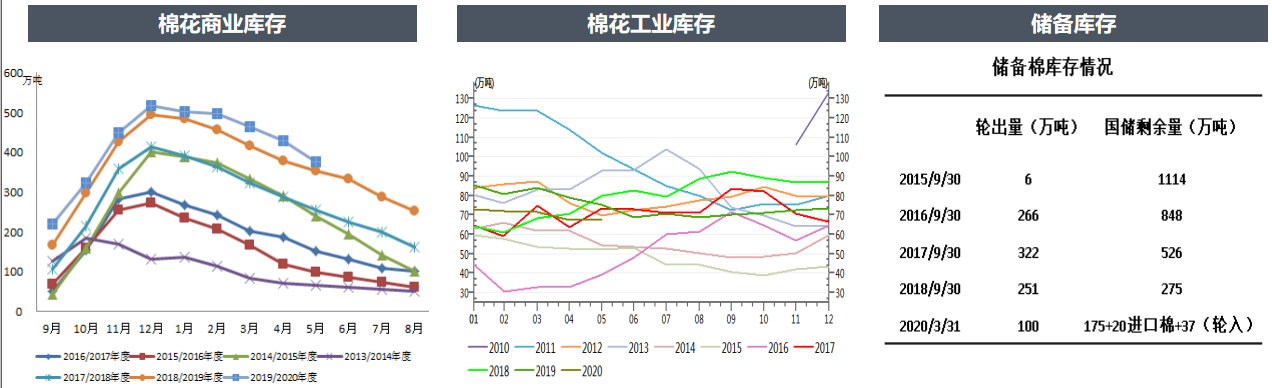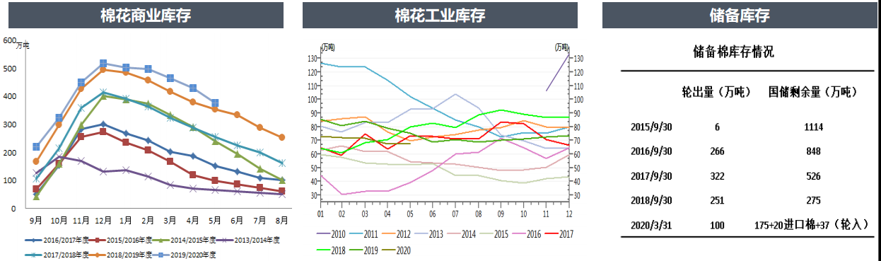 國儲庫存截止3月31日,儲備棉庫存有232萬噸。往年5月已開始輪出儲備棉,今年到現(xiàn)在仍沒有任何輪出消息,考慮今年棉價太低,國家不會再輪出增加市場負(fù)擔(dān),預(yù)計今年輪出可能性較低。