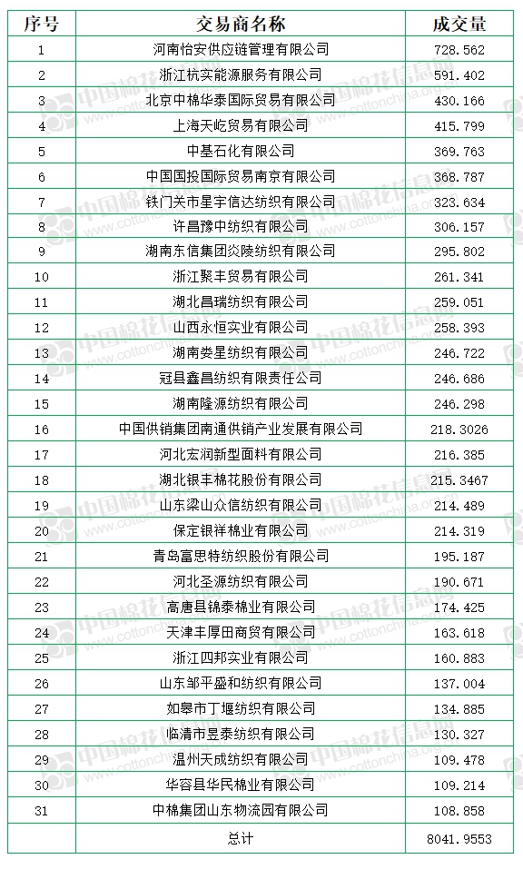 中國儲備棉管理有限公司定于7月7日上市銷售儲備棉重量8041.9553噸,實(shí)際成交8041.9553噸,成交率100%,成交均價(jià)11533元/噸,較6日上漲24元/噸,折3128價(jià)格12835元/噸,較6日下跌92元/噸。