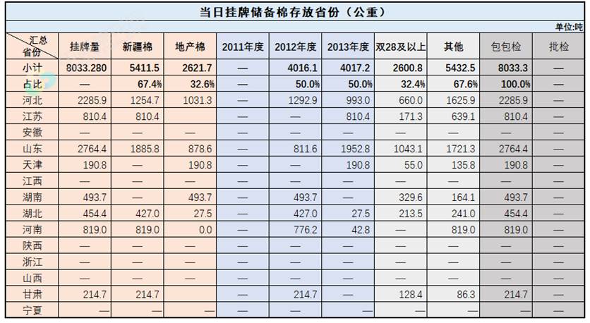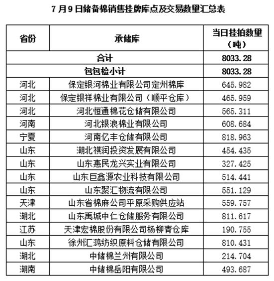 中國儲備棉管理有限公司定于7月9日上市銷售儲備棉重量8033.28噸,共40捆。具體庫點(diǎn)及數(shù)量見下表。